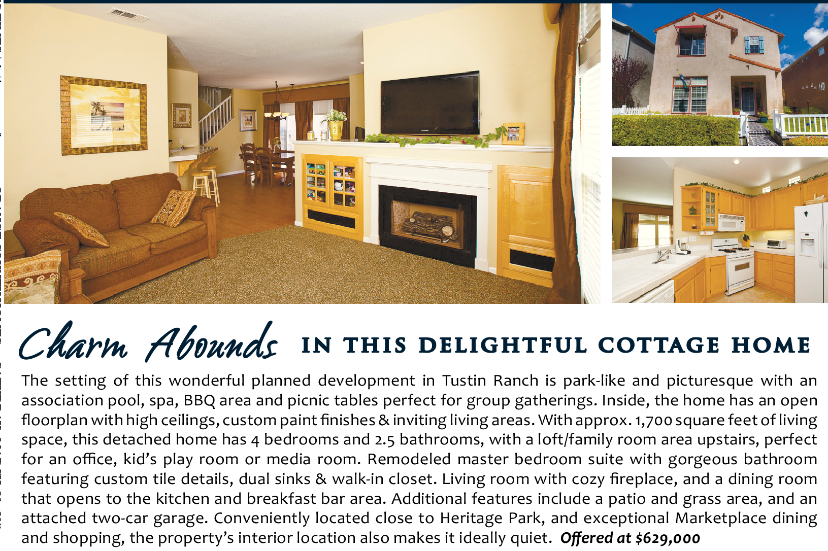 The setting of this wonderful planned development in Tustin Ranch is park-like and picturesque with an association pool, spa, BBQ area and picnic tables perfect for group gatherings. Inside, the home has an open floorplan with high ceilings, custom paint finishes & inviting living areas. With approx. 1,700 square feet of living space, this detached home has 4 bedrooms and 2.5 bathrooms, with a loft/family room area upstairs, perfect for an office, kid’s play room or media room. Remodeled master bedroom suite with gorgeous bathroom featuring custom tile details, dual sinks & walk-in closet. Living room with cozy fireplace, and a dining room that opens to the kitchen and breakfast bar area. Additional features include a patio and grass area, and an attached two-car garage. Conveniently located close to Heritage Park, and exceptional Marketplace dining and shopping, the property’s interior location also makes it ideally quiet. Offered at $629,000