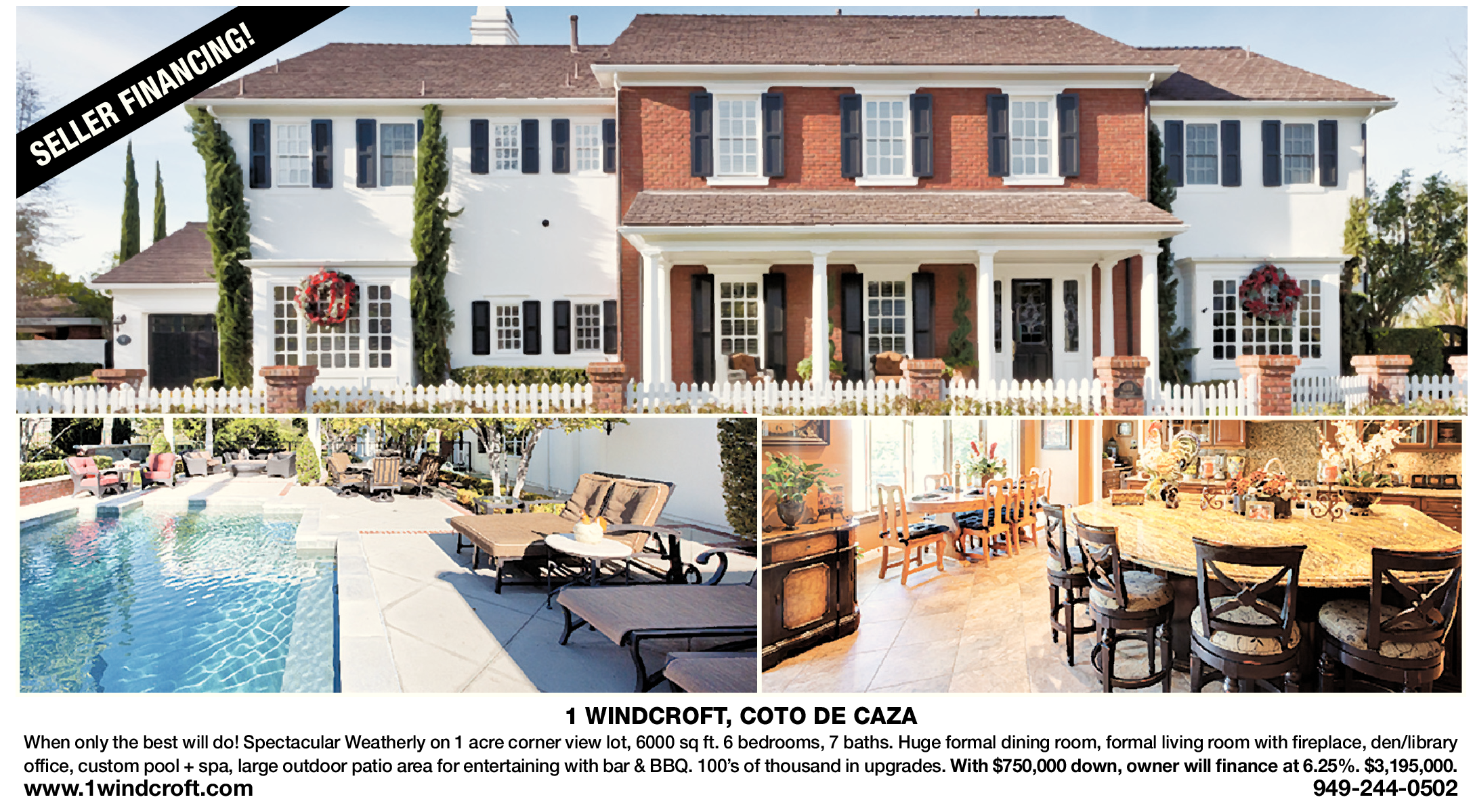 1 WINDCROFT, COTO DE CAZA When only the best will do! Spectacular Weatherly on 1 acre corner view lot, 6000 sq ft. 6 bedrooms, 7 baths. Huge formal dining room, formal living room with fireplace, den/library office, custom pool + spa, large outdoor patio area for entertaining with bar & BBQ. 100’s of thousand in upgrades. With $750,000 down, owner will finance at 6.25%. $3,195,000. www.1windcroft.com 949-244-0502