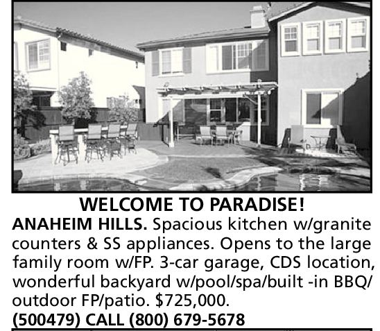 ANAHEIM HILLS. Spacious kitchen w/granite counters & SS appliances. Opens to the large family room w/FP. 3-car garage, CDS location, wonderful backyard w/pool/spa/built -in BBQ/ outdoor FP/patio. $725,000. (500479) CALL (800) 679-5678
