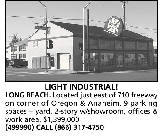 LONG BEACH. Located just east of 710 freeway on corner of Oregon & Anaheim. 9 parking spaces + yard. 2-story w/showroom, offices & work area. $1,399,000. (499990) CALL (866) 317-4750