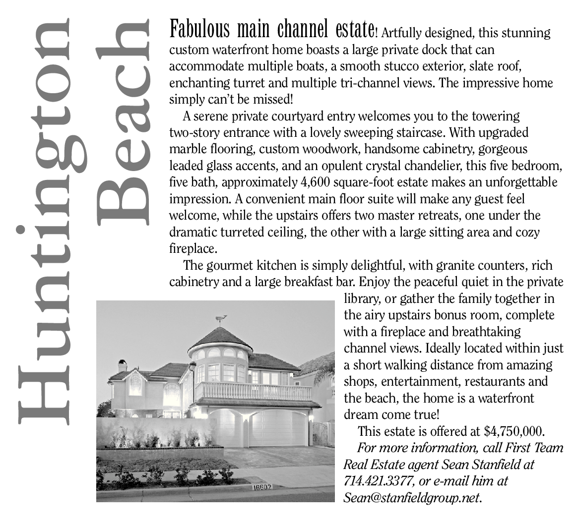 This estate is offered at $4,750,000. For more information, call First Team Real Estate agent Sean Stanfield at 714.421.3377, or e-mail him at Sean@stanfieldgroup.net.