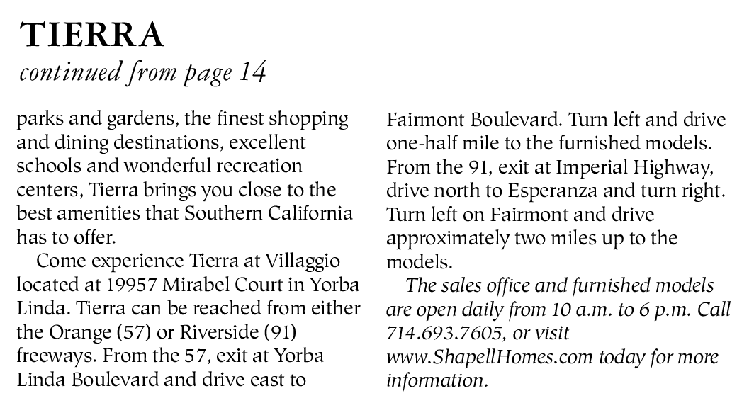 parks and gardens, the finest shopping and dining destinations, excellent schools and wonderful recreation centers, Tierra brings you close to the best amenities that Southern California has to offer.