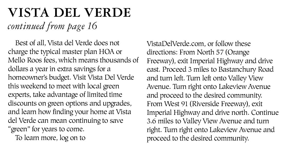 VISTA DEL VERDE continued from page 16 Best of all, Vista del Verde does not charge the typical master plan HOA or Mello Roos fees, which means thousands of dollars a year in extra savings for a homeowner’s budget. Visit Vista Del Verde this weekend to meet with local green experts, take advantage of limited time discounts on green options and upgrades, and learn how finding your home at Vista del Verde can mean continuing to save “green” for years to come. To learn more, log on to VistaDelVerde.com, or follow these directions: From North 57 (Orange Freeway), exit Imperial Highway and drive east. Proceed 3 miles to Bastanchury Road and turn left. Turn left onto Valley View Avenue. Turn right onto Lakeview Avenue and proceed to the desired community. From West 91 (Riverside Freeway), exit Imperial Highway and drive north. Continue 3.6 miles to Valley View Avenue and turn right. Turn right onto Lakeview Avenue and proceed to the desired community.