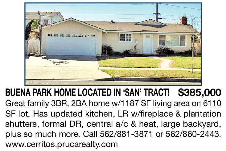 BUENA PARK HOME LOCATED IN ‘SAN’ TRACT! $385,000 Great family 3BR, 2BA home w/1187 SF living area on 6110 SF lot. Has updated kitchen, LR w/fireplace & plantation shutters, formal DR, central a/c & heat, large backyard, plus so much more. Call 562/881-3871 or 562/860-2443. www.cerritos.prucarealty.com
