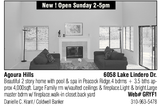 Agoura Hills 6058 Lake Lindero Dr. prox 4,000sqft. Large Family rm w/vaulted ceilings & fireplace.Light & bright.Large Beautiful 2 story home with pool & spa in Peacock Ridge.4 bdrms + 3.5 bths ap- master bdrm w/ fireplace.walk-in closet.back yard Web# GRYF1 Danielle C. Krant / Coldwell Banker 310-963-5478