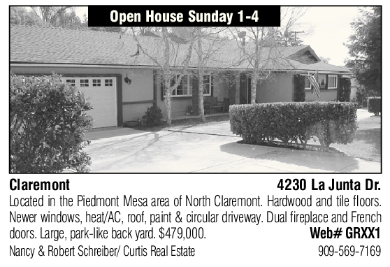 Open House Sunday 1-4 Claremont 4230 La Junta Dr. Located in the Piedmont Mesa area of North Claremont. Hardwood and tile floors. Newer windows, heat/AC, roof, paint & circular driveway. Dual fireplace and French doors. Large, park-like back yard. $479,000. Web# GRXX1 Nancy & Robert Schreiber/ Curtis Real Estate 909-569-7169 See also