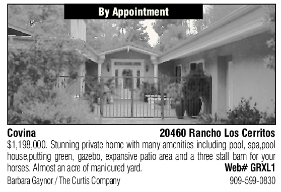 By Appointment Covina 20460 Rancho Los Cerritos $1,198,000. Stunning private home with many amenities including pool, spa,pool house,putting green, gazebo, expansive patio area and a three stall barn for your horses. Almost an acre of manicured yard. Web# GRXL1 Barbara Gaynor / The Curtis Company 909-599-0830