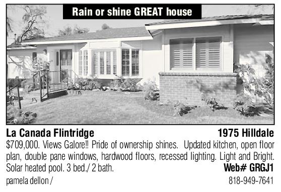 Rain or shine GREAT house La Canada Flintridge 1975 Hilldale $709,000. Views Galore!! Pride of ownership shines. Updated kitchen, open floor plan, double pane windows, hardwood floors, recessed lighting. Light and Bright. Solar heated pool. 3 bed./ 2 bath. Web# GRGJ1 pamela dellon / 818-949-7641