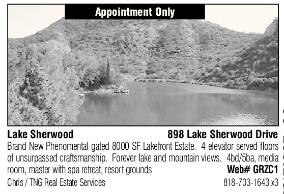 Lake Sherwood 898 Lake Sherwood Drive Brand New Phenomental gated 8000 SF Lakefront Estate. 4 elevator served floors of unsurpassed craftsmanship. Forever lake and mountain views. 4bd/5ba, media room, master with spa retreat, resort grounds Web# GRZC1 Chris / TNG Real Estate Services 818-703-1643 x3