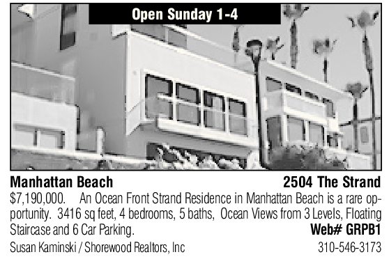 Open Sunday 1-4 Manhattan Beach 2504 The Strand portunity. 3416 sq feet, 4 bedrooms, 5 baths, Ocean Views from 3 Levels, Floating $7,190,000. An Ocean Front Strand Residence in Manhattan Beach is a rare op- Staircase and 6 Car Parking. Web# GRPB1 Susan Kaminski / Shorewood Realtors, Inc 310-546-3173 See also