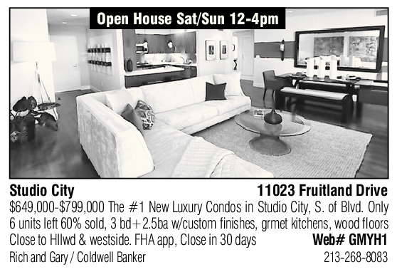 Open House Sat/Sun 12-4pm Studio City 11023 Fruitland Drive $649,000-$799,000 The #1 New Luxury Condos in Studio City, S. of Blvd. Only 6 units left 60% sold, 3 bd+2.5ba w/custom finishes, grmet kitchens, wood floors Close to Hllwd & westside. FHA app, Close in 30 days Web# GMYH1 Rich and Gary / Coldwell Banker 213-268-8083