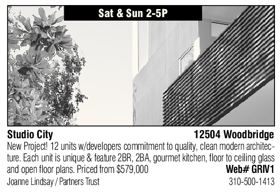 Sat & Sun 2-5P Studio City 12504 Woodbridge New Project! 12 units w/developers commitment to quality, clean modern architecture. Each unit is unique & feature 2BR, 2BA, gourmet kitchen, floor to ceiling glass and open floor plans. Priced from $579,000 Web# GRIV1 Joanne Lindsay / Partners Trust 310-500-1413