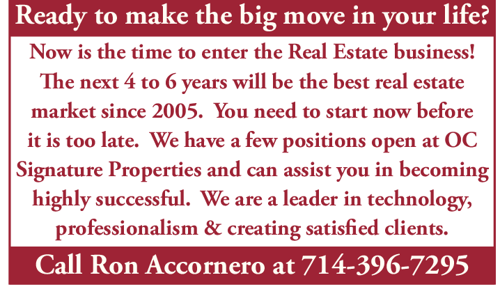 Ready to make the big move in your life? Now is the time to enter the Real Estate business! The next 4 to 6 years will be the best real estate market since 2005. You need to start now before it is too late. We have a few positions open at OC Signature Properties and can assist you in becoming highly successful. We are a leader in technology, professionalism & creating satisfied clients. Call Ron Accornero at 714-396-7295