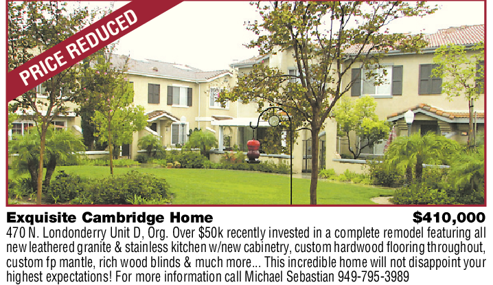 Exquisite Cambridge Home $410,000 470 N. Londonderry Unit D, Org. Over $50k recently invested in a complete remodel featuring all new leathered granite & stainless kitchen w/new cabinetry, custom hardwood flooring throughout, custom fp mantle, rich wood blinds & much more... This incredible home will not disappoint your highest expectations! For more information call Michael Sebastian 949-795-3989