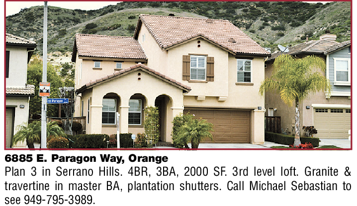 6885 E. Paragon Way, Orange Plan 3 in Serrano Hills. 4BR, 3BA, 2000 SF. 3rd level loft. Granite & travertine in master BA, plantation shutters. Call Michael Sebastian to see 949-795-3989.