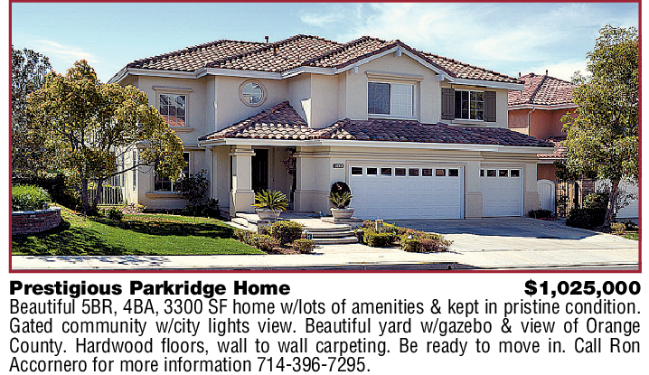 Prestigious Parkridge Home $1,025,000 Beautiful 5BR, 4BA, 3300 SF home w/lots of amenities & kept in pristine condition. Gated community w/city lights view. Beautiful yard w/gazebo & view of Orange County. Hardwood floors, wall to wall carpeting. Be ready to move in. Call Ron Accornero for more information 714-396-7295.