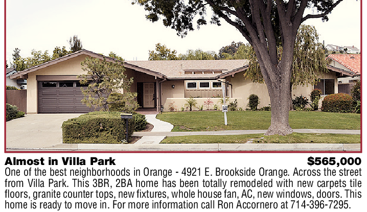 Almost in Villa Park $565,000 One of the best neighborhoods in Orange - 4921 E. Brookside Orange. Across the street from Villa Park. This 3BR, 2BA home has been totally remodeled with new carpets tile floors, granite counter tops, new fixtures, whole house fan, AC, new windows, doors. This home is ready to move in. For more information call Ron Accornero at 714-396-7295.