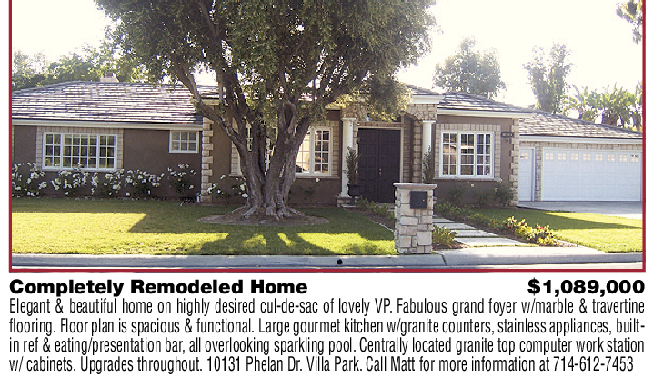Completely Remodeled Home $1,089,000 Elegant & beautiful home on highly desired cul-de-sac of lovely VP. Fabulous grand foyer w/marble & travertine flooring. Floor plan is spacious & functional. Large gourmet kitchen w/granite counters, stainless appliances, builtin ref & eating/presentation bar, all overlooking sparkling pool. Centrally located granite top computer work station w/ cabinets. Upgrades throughout. 10131 Phelan Dr. Villa Park. Call Matt for more information at 714-612-7453