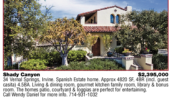 Shady Canyon $2,395,000 34 Vernal Springs, Irvine. Spanish Estate home. Approx 4820 SF, 4BR (incl. guest casita) 4.5BA. Living & dining room, gourmet kitchen family room, library & bonus room. The homes patio, courtyard & loggias are perfect for entertaining. Call Wendy Daniel for more info. 714-931-1032