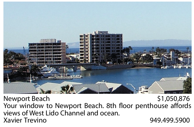 Newport Beach $1,050,876 Your window to Newport Beach. 8th floor penthouse affords views of West Lido Channel and ocean. Xavier Trevino 949.499.5900