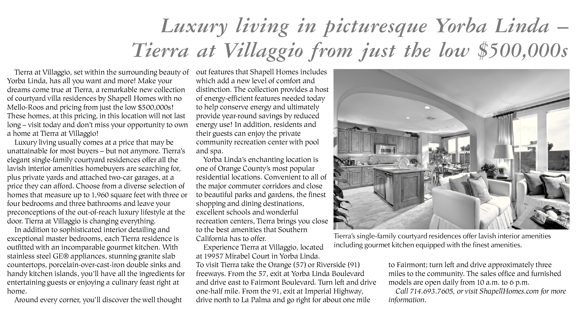 Tierra at Villaggio, set within the surrounding beauty of Yorba Linda, has all you want and more! Make your dreams come true at Tierra, a remarkable new collection of courtyard villa residences by Shapell Homes with no Mello-Roos and pricing from just the low $500,000s! These homes, at this pricing, in this location will not last long – visit today and don’t miss your opportunity to own a home at Tierra at Villaggio!