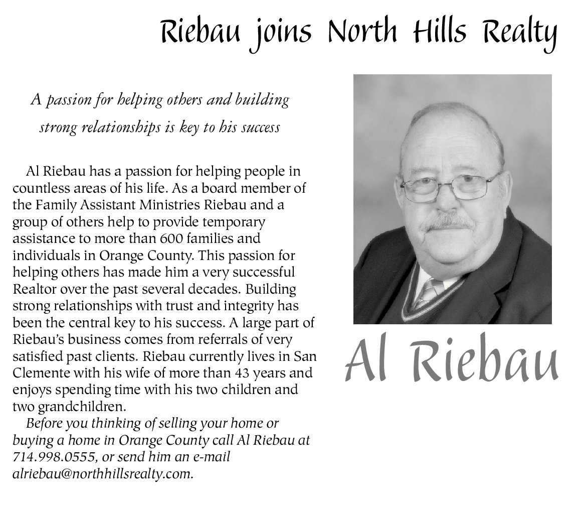Al Riebau has a passion for helping people in countless areas of his life. As a board member of the Family Assistant Ministries Riebau and a group of others help to provide temporary assistance to more than 600 families and individuals in Orange County. This passion for helping others has made him a very successful Realtor over the past several decades. Building strong relationships with trust and integrity has been the central key to his success. A large part of Riebau’s business comes from referrals of very satisfied past clients. Riebau currently lives in San Clemente with his wife of more than 43 years and enjoys spending time with his two children and two grandchildren.