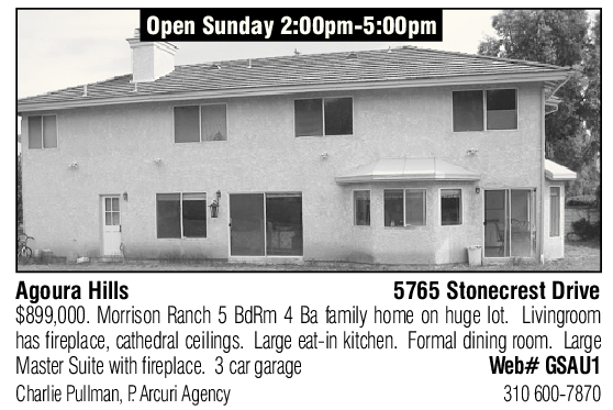 Agoura Hills 5765 Stonecrest Drive $899,000. Morrison Ranch 5 BdRm 4 Ba family home on huge lot. Livingroom has fireplace, cathedral ceilings. Large eat-in kitchen. Formal dining room. Large Master Suite with fireplace. 3 car garage Web# GSAU1 Charlie Pullman, P. Arcuri Agency 310 600-7870