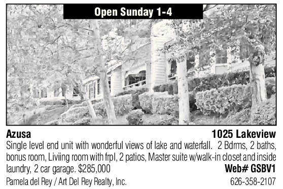 Azusa 1025 Lakeview Single level end unit with wonderful views of lake and waterfall. 2 Bdrms, 2 baths, bonus room, Liviing room with frpl, 2 patios, Master suite w/walk-in closet and inside laundry, 2 car garage. $285,000 Web# GSBV1 Pamela del Rey / Art Del Rey Realty, Inc. 626-358-2107