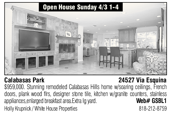 Calabasas Park 24527 Via Esquina $959,000. Stunning remodeled Calabasas Hills home w/soaring ceilings, French doors, plank wood flrs, designer stone tile, kitchen w/granite counters, stainless appliances,enlarged breakfast area.Extra lg yard. Web# GSBL1 Holly Krupnick / White House Properties 818-212-8759