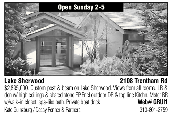 Lake Sherwood 2108 Trentham Rd $2,895,000. Custom post & beam on Lake Sherwood. Views from all rooms. LR & den w/ high ceilings & shared stone FP. Encl outdoor DR & top line Kitchn. Mster BR w/walk-in closet, spa-like bath. Private boat dock Web# GRUI1 Kate Guinzburg / Deasy Penner & Partners 310-801-2759