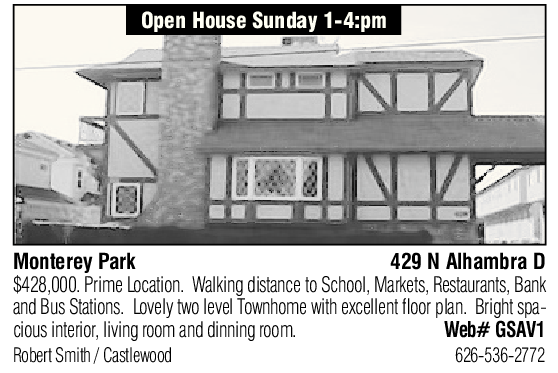Monterey Park 429 N Alhambra D $428,000. Prime Location. Walking distance to School, Markets, Restaurants, Bank and Bus Stations. Lovely two level Townhome with excellent floor plan. Bright spacious interior, living room and dinning room. Web# GSAV1 Robert Smith / Castlewood 626-536-2772