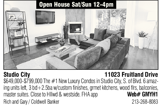 Studio City 11023 Fruitland Drive $649,000-$799,000 The #1 New Luxury Condos in Studio City, S. of Blvd. 6 amazing units left, 3 bd+2.5ba w/custom finishes, grmet kitchens, wood flrs, balconies, master suites. Close to Hllwd & westside. FHA app Web# GMYH1 Rich and Gary / Coldwell Banker 213-268-8083