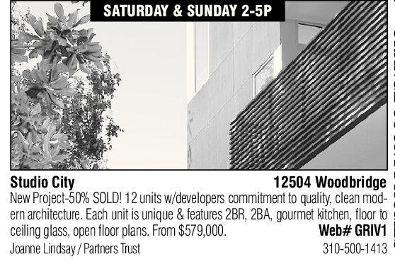 Studio City 12504 Woodbridge ern architecture. Each unit is unique & features 2BR, 2BA, gourmet kitchen, floor to New Project-50% SOLD! 12 units w/developers commitment to quality, clean mod- ceiling glass, open floor plans. From $579,000. Web# GRIV1 Joanne Lindsay / Partners Trust 310-500-1413