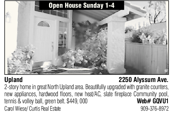 Upland 2250 Alyssum Ave. 2-story home in great North Upland area. Beautifully upgraded with granite counters, new appliances, hardwood floors, new heat/AC, slate fireplace Community pool, tennis & volley ball, green belt. $449, 000 Web# GQVU1 Carol Wiese/ Curtis Real Estate 909-376-8972