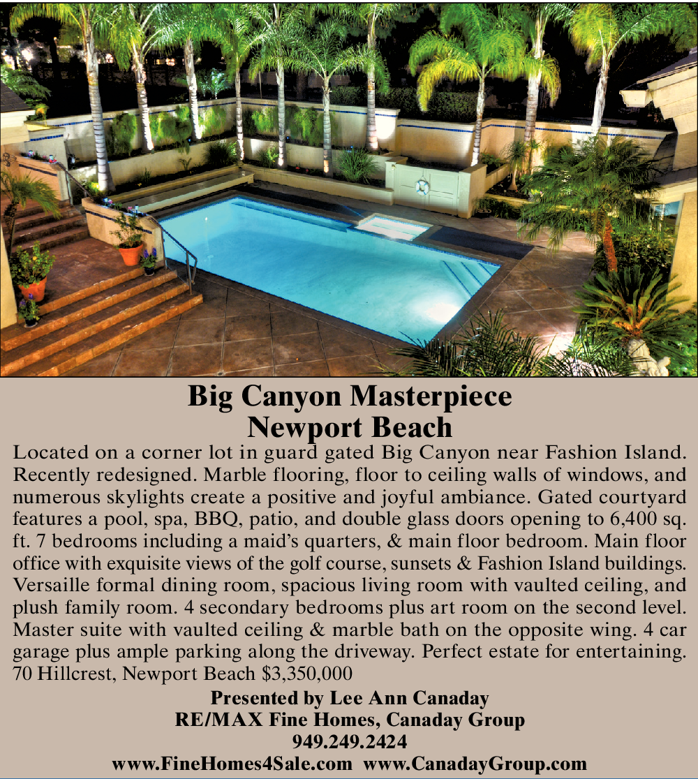 Big Canyon Masterpiece Newport Beach Located on a corner lot in guard gated Big Canyon near Fashion Island. Recently redesigned. Marble flooring, floor to ceiling walls of windows, and numerous skylights create a positive and joyful ambiance. Gated courtyard features a pool, spa, BBQ, patio, and double glass doors opening to 6,400 sq. ft. 7 bedrooms including a maid’s quarters, & main floor bedroom. Main floor office with exquisite views of the golf course, sunsets & Fashion Island buildings. Versaille formal dining room, spacious living room with vaulted ceiling, and plush family room. 4 secondary bedrooms plus art room on the second level. Master suite with vaulted ceiling & marble bath on the opposite wing. 4 car garage plus ample parking along the driveway. Perfect estate for entertaining. 70 Hillcrest, Newport Beach $3,350,000 Presented by Lee Ann Canaday RE/MAX Fine Homes, Canaday Group 949.249.2424 www.FineHomes4Sale.com www.CanadayGroup.com