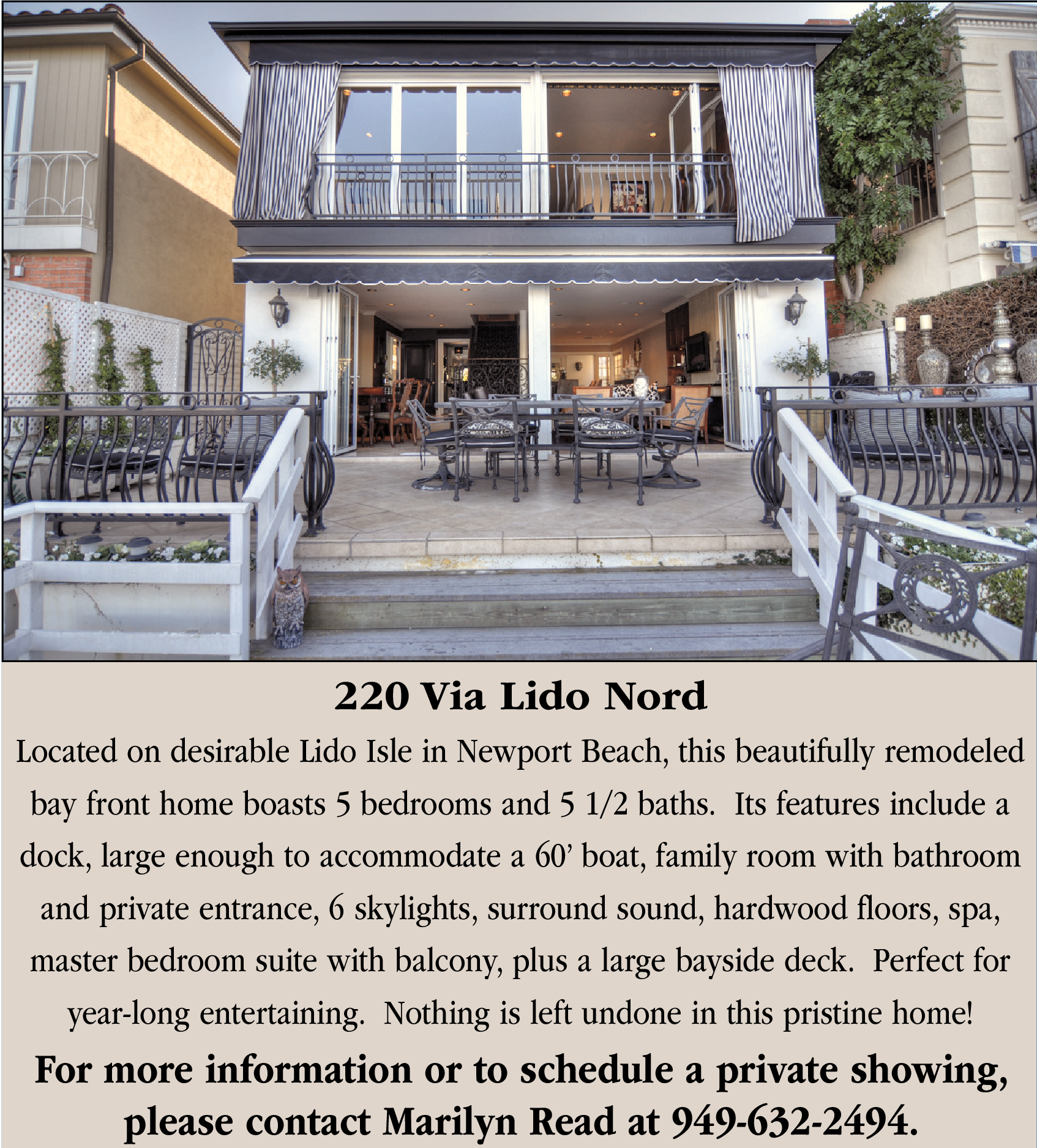 220 Via Lido Nord Located on desirable Lido Isle in Newport Beach, this beautifully remodeled bay front home boasts 5 bedrooms and 5 1/2 baths. Its features include a dock, large enough to accommodate a 60’ boat, family room with bathroom and private entrance, 6 skylights, surround sound, hardwood floors, spa, master bedroom suite with balcony, plus a large bayside deck. Perfect for year-long entertaining. Nothing is left undone in this pristine home! For more information or to schedule a private showing, please contact Marilyn Read at 949-632-2494.