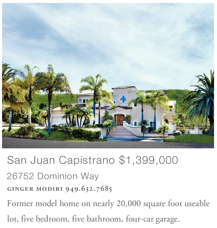 San Juan Capistrano $1,399,000 26752 Dominion Way ginger modiri 949.632.7685 Former model home on nearly 20,000 square foot useable lot, five bedroom, five bathroom, four-car garage.