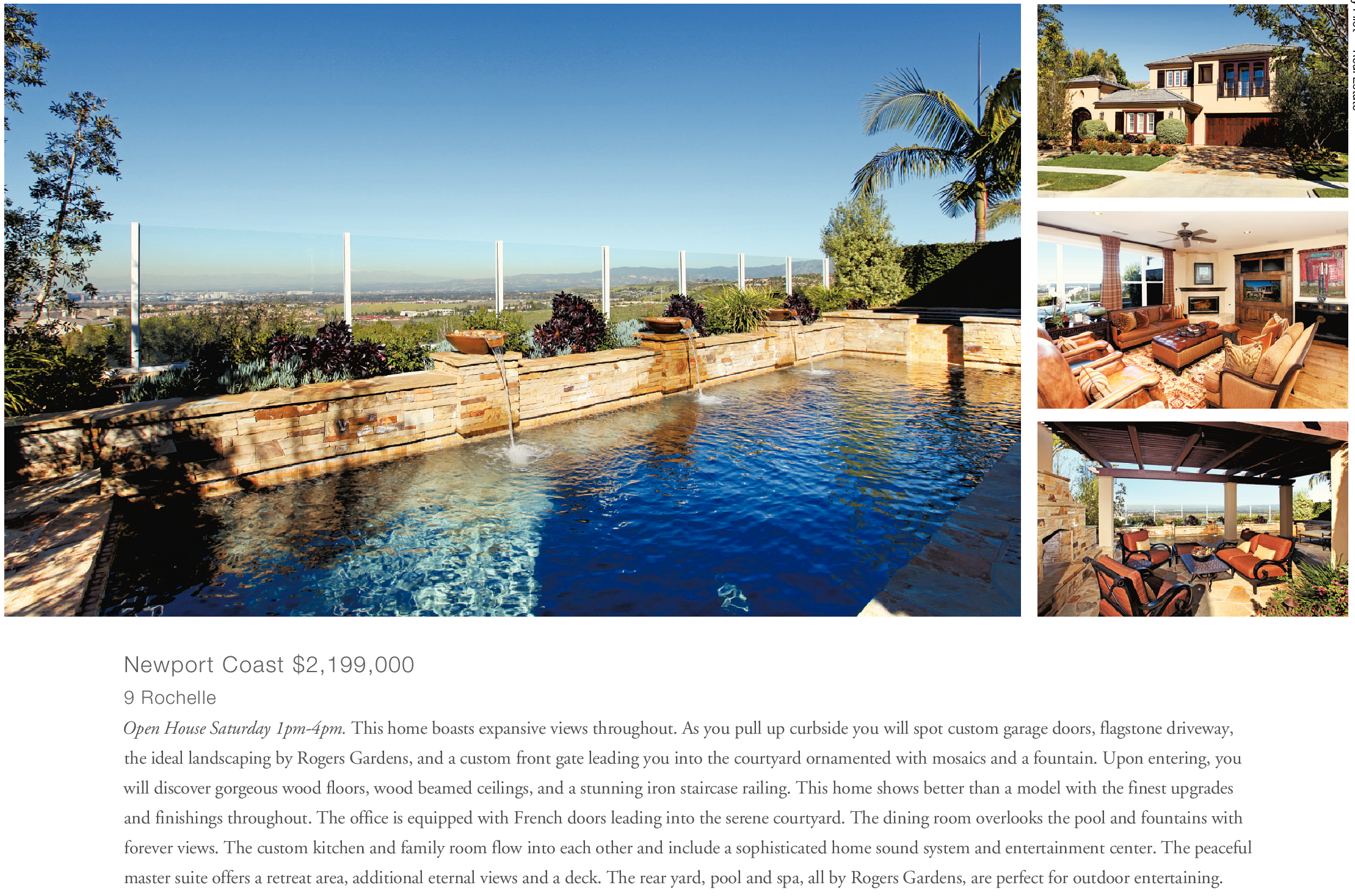 Newport Coast $2,199,000 9 Rochelle Open House Saturday 1pm-4pm. This home boasts expansive views throughout. As you pull up curbside you will spot custom garage doors, flagstone driveway, the ideal landscaping by Rogers Gardens, and a custom front gate leading you into the courtyard ornamented with mosaics and a fountain. Upon entering, you will discover gorgeous wood floors, wood beamed ceilings, and a stunning iron staircase railing. This home shows better than a model with the finest upgrades and finishings throughout. The office is equipped with French doors leading into the serene courtyard. The dining room overlooks the pool and fountains with forever views. The custom kitchen and family room flow into each other and include a sophisticated home sound system and entertainment center. The peaceful master suite offers a retreat area, additional eternal views and a deck. The rear yard, pool and spa, all by Rogers Gardens, are perfect for outdoor entertaining.
