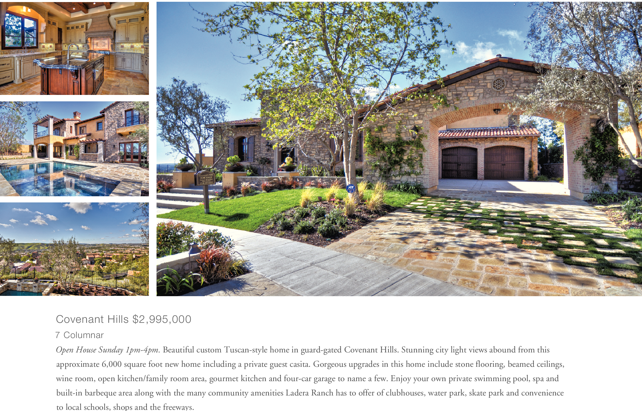 Open House Sunday 1pm-4pm. Beautiful custom Tuscan-style home in guard-gated Covenant Hills. Stunning city light views abound from this approximate 6,000 square foot new home including a private guest casita. Gorgeous upgrades in this home include stone flooring, beamed ceilings, wine room, open kitchen/family room area, gourmet kitchen and four-car garage to name a few. Enjoy your own private swimming pool, spa and built-in barbeque area along with the many community amenities Ladera Ranch has to offer of clubhouses, water park, skate park and convenience to local schools, shops and the freeways.