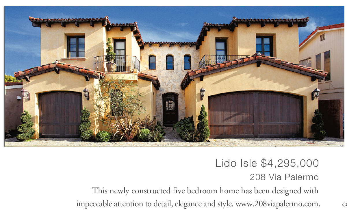 Lido Isle $4,295,000 208 Via Palermo This newly constructed five bedroom home has been designed with impeccable attention to detail, elegance and style. www.208viapalermo.com.