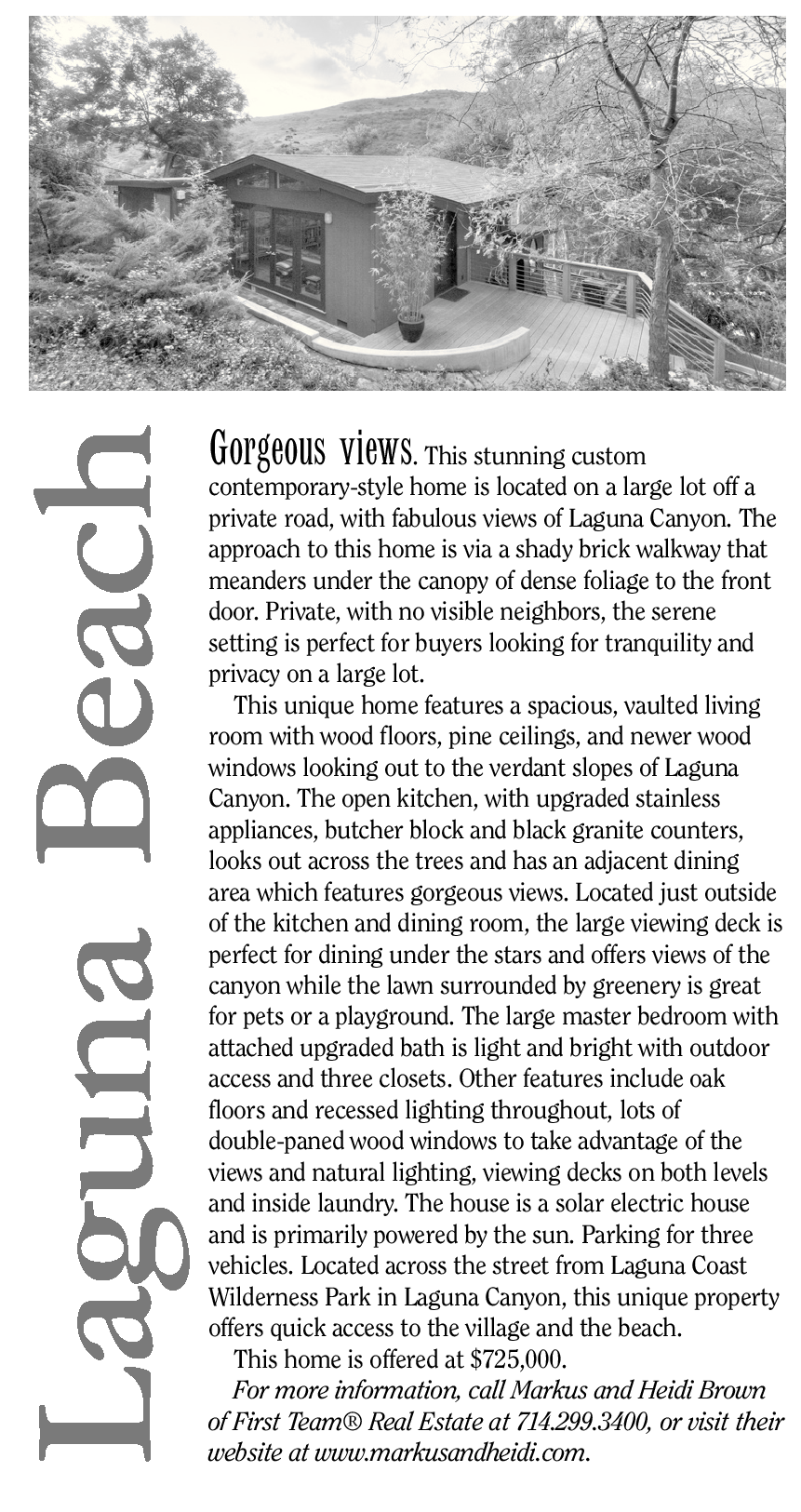 Gorgeous views. This stunning custom contemporary-style home is located on a large lot off a private road, with fabulous views of Laguna Canyon. The approach to this home is via a shady brick walkway that meanders under the canopy of dense foliage to the front door. Private, with no visible neighbors, the serene setting is perfect for buyers looking for tranquility and privacy on a large lot. This unique home features a spacious, vaulted living room with wood floors, pine ceilings, and newer wood windows looking out to the verdant slopes of Laguna Canyon. The open kitchen, with upgraded stainless appliances, butcher block and black granite counters, looks out across the trees and has an adjacent dining area which features gorgeous views. Located just outside of the kitchen and dining room, the large viewing deck is perfect for dining under the stars and offers views of the canyon while the lawn surrounded by greenery is great for pets or a playground. The large master bedroom with attached upgraded bath is light and bright with outdoor access and three closets. Other features include oak floors and recessed lighting throughout, lots of double-paned wood windows to take advantage of the views and natural lighting, viewing decks on both levels and inside laundry. The house is a solar electric house and is primarily powered by the sun. Parking for three vehicles. Located across the street from Laguna Coast Wilderness Park in Laguna Canyon, this unique property offers quick access to the village and the beach. This home is offered at $725,000. For more information, call Markus and Heidi Brown of First Team® Real Estate at 714.299.3400, or visit their website at www.markusandheidi.com.
