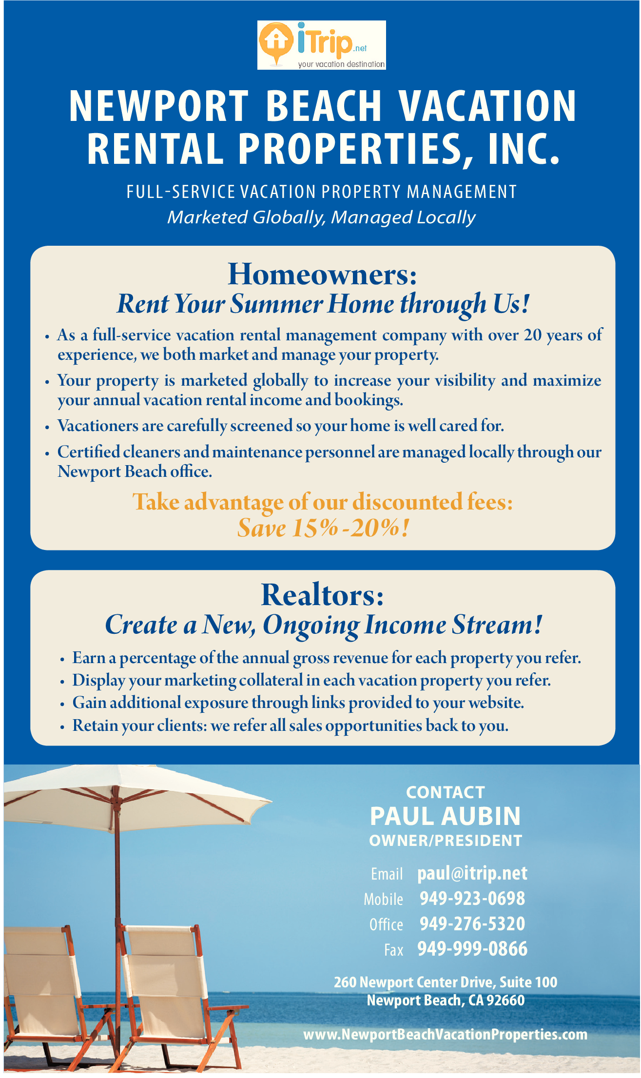 NEWPORT BEACH VACATION RENTAL PROPERTIES, INC. FULL-SERVICE VACATION PROPERTY MANAGEMENT Marketed Globally, Managed Locally Homeowners: Rent Your Summer Home through Us! • As a full-service vacation rental management company with over 20 years of experience,webothmarketandmanageyourproperty. • Your property is marketed globally to increase your visibility and maximize your annual vacation rental income and bookings. • Vacationersarecarefullyscreenedsoyourhomeiswellcaredfor. • Certified cleaners and maintenance personnel are managed locally through our Newport Beach office. Take advantage of our discounted fees: Save 15% -20%! Realtors: Create a New, Ongoing Income Stream! • Earnapercentageoftheannualgross revenue for each property you refer. • Display your marketing collateral in each vacation property you refer. • Gain additional exposure through links provided to your website. • Retain your clients: we refer all sales opportunities back to you. CONTACT PAUL AUBIN OWNER/PRESIDENT Email paul@itrip.net Mobile 949-923-0698 Office 949-276-5320 Fax 949-999-0866 260 Newport Center Drive, Suite 100 Newport Beach, CA 92660 www.NewportBeachVacationProperties.com