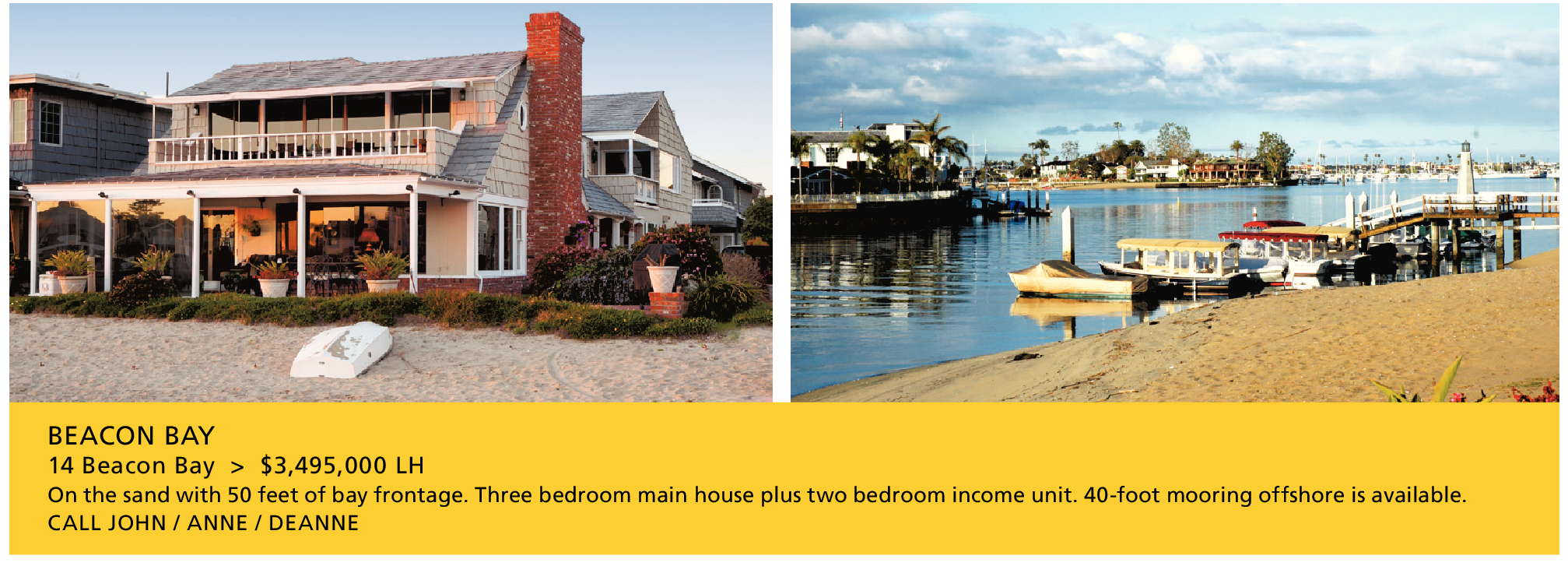 BEACON BAY 14 Beacon Bay > $3,495,000 LH On the sand with 50 feet of bay frontage. Three bedroom main house plus two bedroom income unit. 40-foot mooring offshore is available. CALL JOHN / ANNE / DEANNE