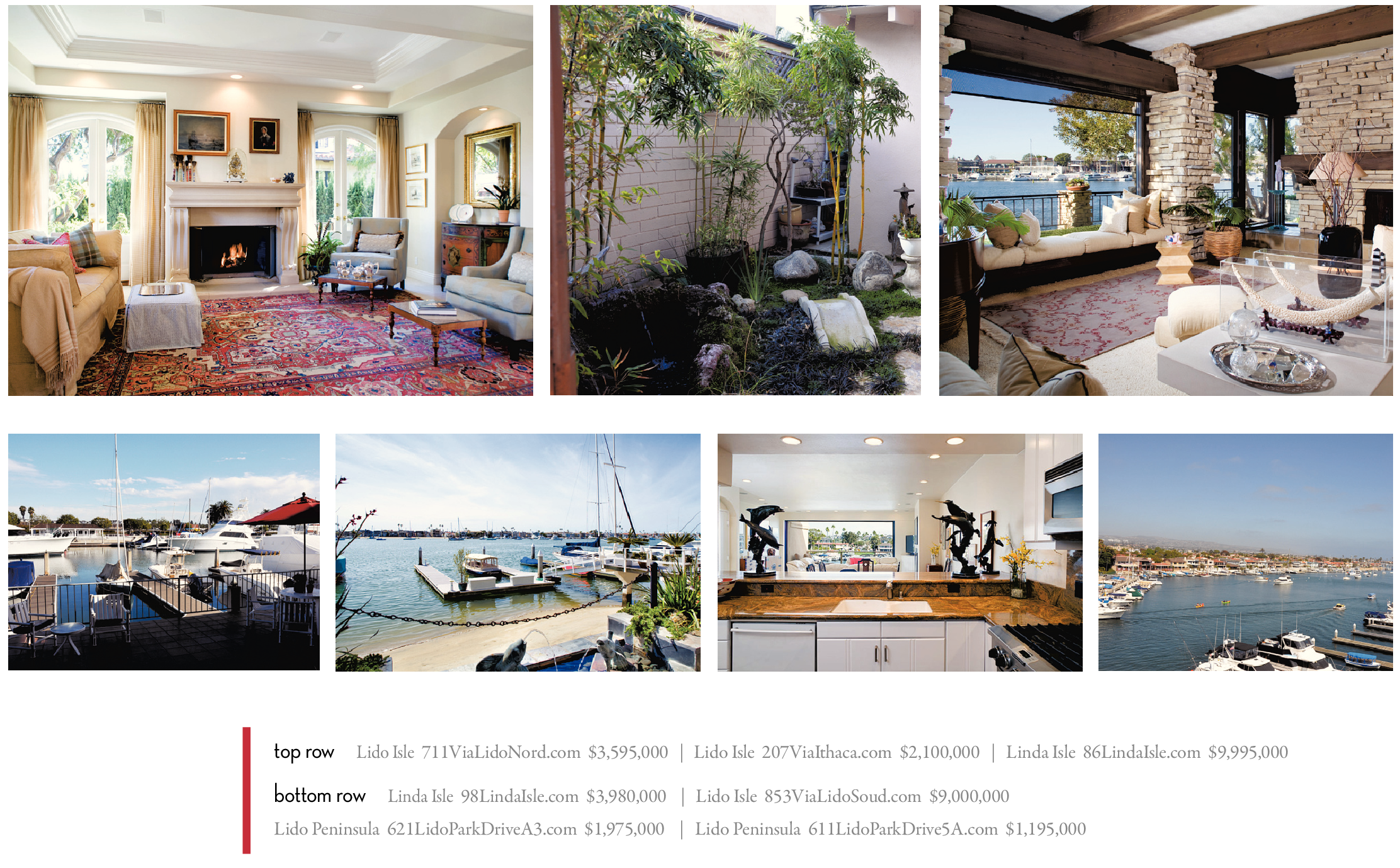 top row Lido Isle 711ViaLidoNord.com $3,595,000 | Lido Isle 207ViaIthaca.com $2,100,000 | Linda Isle 86LindaIsle.com $9,995,000 bottom row Linda Isle 98LindaIsle.com $3,980,000 | Lido Isle 853ViaLidoSoud.com $9,000,000 Lido Peninsula 621LidoParkDriveA3.com $1,975,000 | Lido Peninsula 611LidoParkDrive5A.com $1,195,000