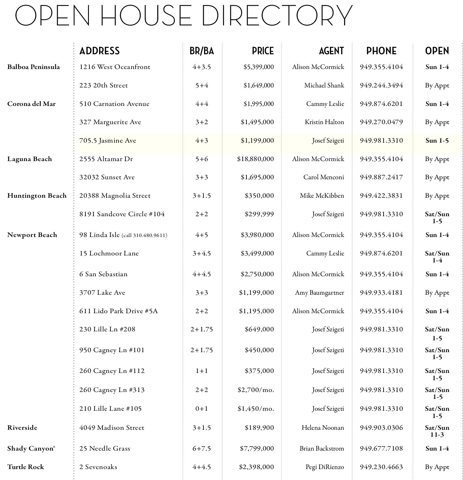 705.5 Jasmine Ave 4+3 $1,199,000 Josef Szigeti 949.981.3310 Sun 1-5
