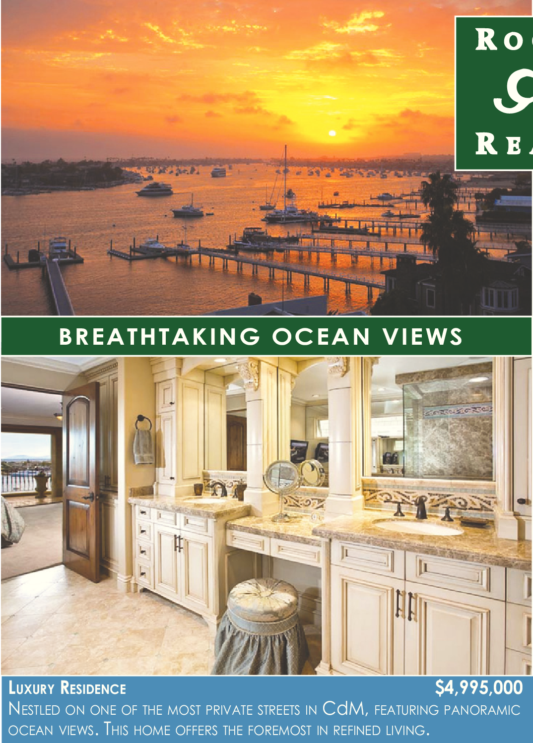 LUXURY RESIDENCE NESTLED ON ONE OF THE MOST PRIVATE OCEAN VIEWS. THIS HOME OFFERS BREATHTAKING OCEAN VIEWS LUXURY RESIDENCE $4,995,000 NESTLED ON ONE OF THE MOST PRIVATE STREETS IN CdM, FEATURING PANORAMIC OCEAN VIEWS. THIS HOME OFFERS THE FOREMOST IN REFINED LIVING.