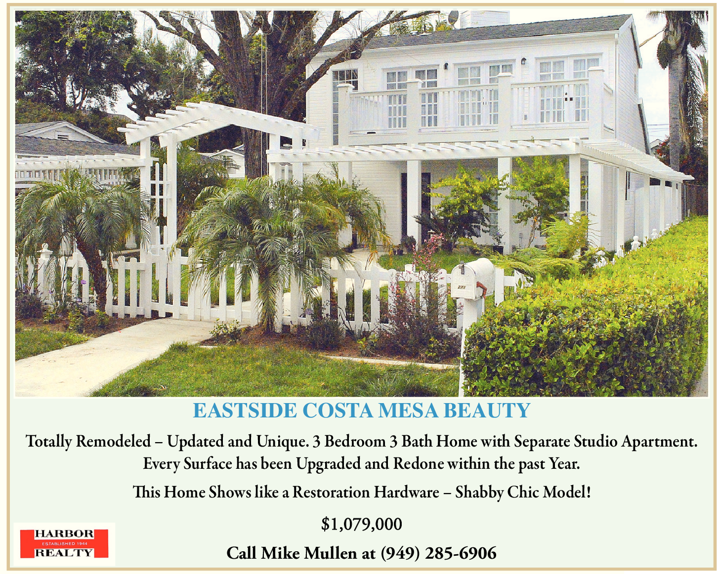EASTSIDE COSTA MESA BEAUTY Totally Remodeled – Updated and Unique. 3 Bedroom 3 Bath Home with Separate Studio Apartment. Every Surface has been Upgraded and Redone within the past Year. This Home Shows like a Restoration Hardware – Shabby Chic Model! $1,079,000 Call Mike Mullen at (949) 285-6906