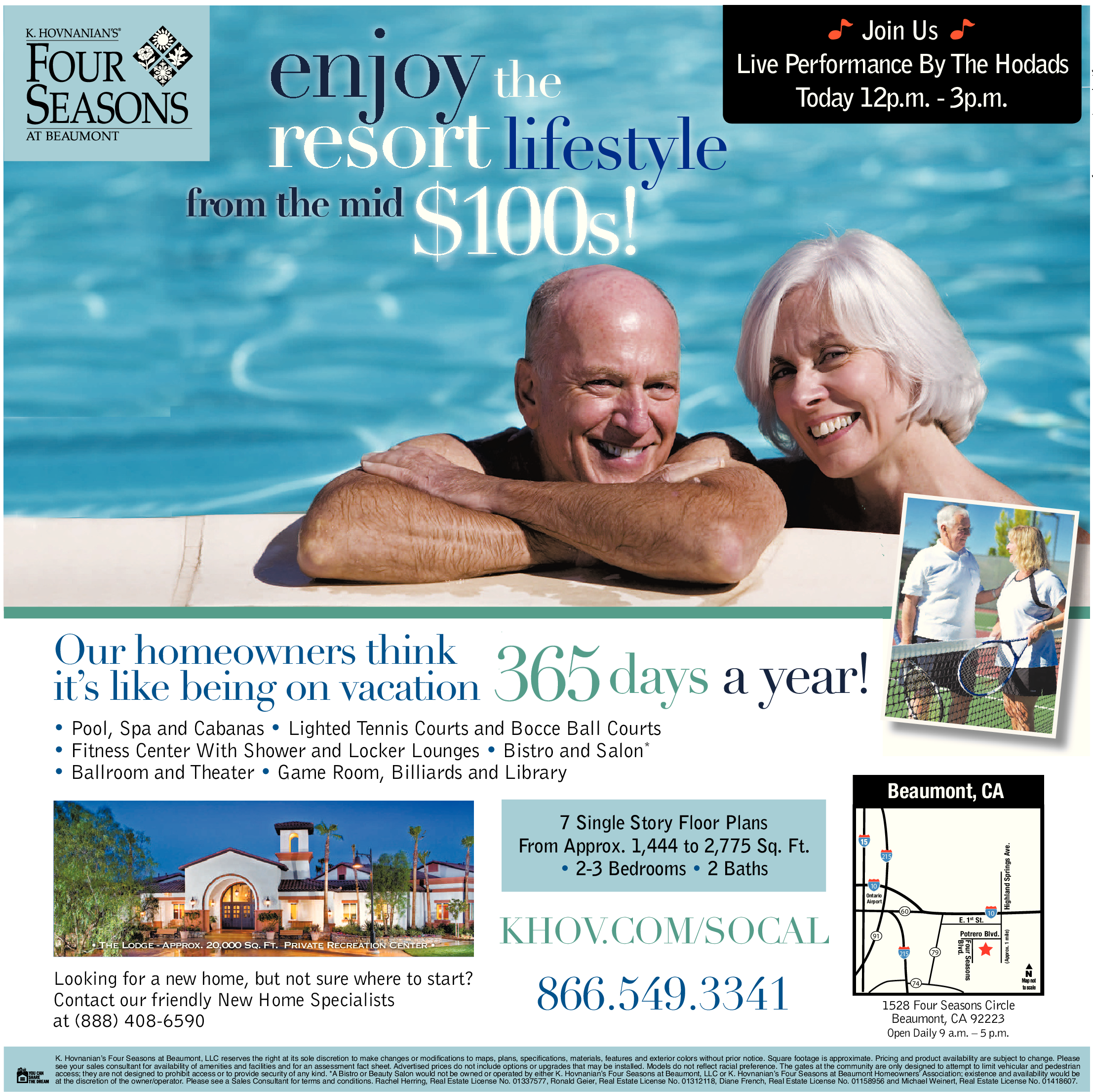 K. Hovnanian’s Four Seasons at Beaumont, LLC reserves the right at its sole discretion to make changes or modifications to maps, plans, specifications, materials, features and exterior colors without prior notice. Square footage is approximate. Pricing and product availability are subject to change. Please see your sales consultant for availability of amenities and facilities and for an assessment fact sheet. Advertised prices do not include options or upgrades that may be installed. Models do not reflect racial preference. The gates at the community are only designed to attempt to limit vehicular and pedestrian access; they are not designed to prohibit access or to provide security of any kind. *A Bistro or Beauty Salon would not be owned or operated by either K. Hovnanian’s Four Seasons at Beaumont, LLC or K. Hovnanian’s Four Seasons at Beaumont Homeowners’ Association; existence and availability would be at the discretion of the owner/operator. Please see a Sales Consultant for terms and conditions. Rachel Herring, Real Estate License No. 01337577, Ronald Geier, Real Estate License No. 01312118, Diane French, Real Estate License No. 01158956 and Michael Weinert, Real Estate License No. 01418607.