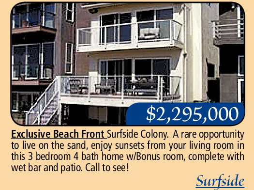 Exclusive Beach Front Surfside Colony. A rare opportunity to live on the sand, enjoy sunsets from your living room in this 3 bedroom 4 bath home w/Bonus room, complete with wet bar and patio. Call to see!