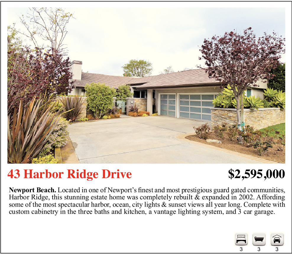 Newport Beach. Located in one of Newport’s finest and most prestigious guard gated communities, Harbor Ridge, this stunning estate home was completely rebuilt & expanded in 2002. Affording some of the most spectacular harbor, ocean, city lights & sunset views all year long. Complete with custom cabinetry in the three baths and kitchen, a vantage lighting system, and 3 car garage.